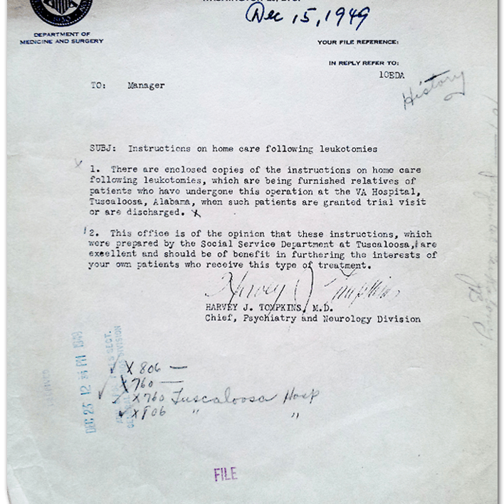 In 1949, Dr. António Caetano de Abreu Freire Egas Moniz was awarded the prestigious Nobel Prize in Physiology or Medicine, along with physiologist Walter Rudolf Hess, for the development of the prefrontal leukotomy. A polarizing procedure, many clinicians and researchers thought the leuokotomy would revolutionize medicine and psychiatry. It would also ignite the flames of research in Dr. Walter Freeman and Dr. James Watts with the development of the transorbital lobotomy. In that same year, the United States Veterans Administration began providing post-surgical care instructions to families of soldiers and veterans who had been given a prefrontal leukotomy.