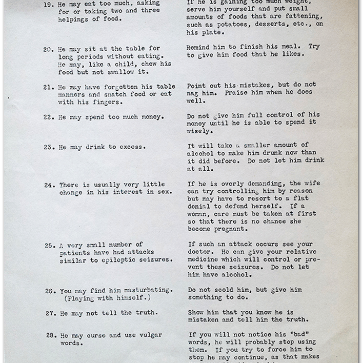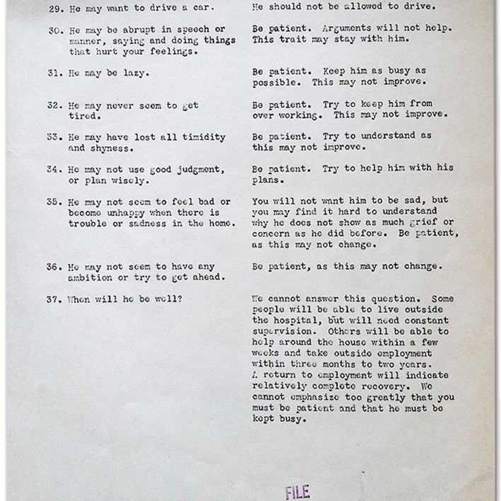 The “Home Care Following Leukotomy” publication outlined tips for families receiving soldiers and veterans back into their care along with what to expect. Interestingly, the document notes that “He [the soldier or veteran] may act like a young child, be cross, irritable, fussy, but with your help these actions may disappear over time.” This document also highlighted the importance of patience and keeping the lobotomized patient constantly busy.
