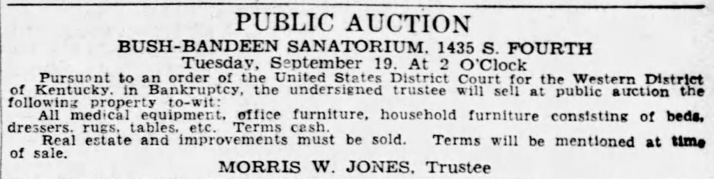 As Doctors Bush and Bandeen began seeing both cancer and tubercular patients, staff began noticing that patients were dying at a noticeable rate. However, as the new decade came upon them, the Bush-Bandeen Sanatorium would experience troubles. Dr. Bush and Dr. Bandeen would eventually be forced to part ways. By 1933, Dr. Stanley G. Bandeen filed a voluntary petition in the U.S. Federal District Court for bankruptcy. Dr. Bandeen listed the available assets of the Sanatorium at $16,970; however, their liabilities far exceeded their available funds at $25,592. On Tuesday, September 19, 1933, pursuant to an order of the United States District Court for the Western District of Kentucky, Bankruptcy Division, a public auction was held at 1435 South Fourth Street. The following property, to-wit, went up for public auction: all medical equipment in the sanatorium, office furniture, household furniture to include beds and dressers, rugs, and various tables among many other items. The stipulation was that all real estate and improvements must be sold at the time of the auction.