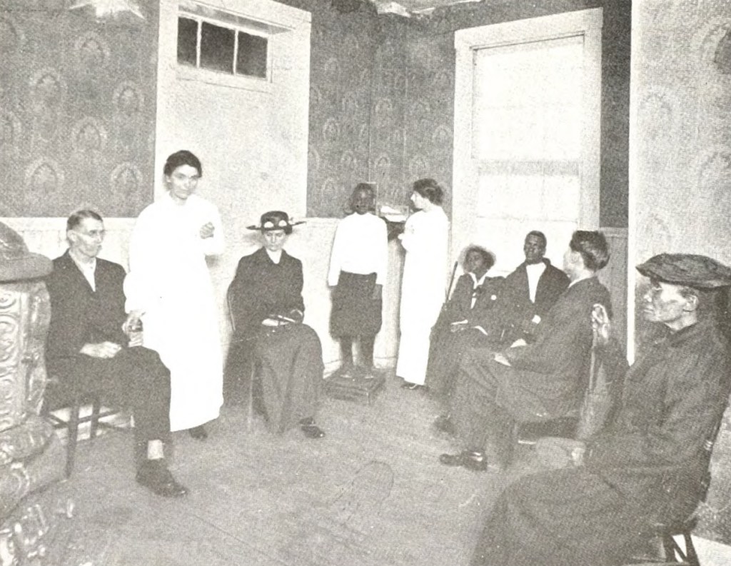 And so, community by community, county by county, the idea of having a full-time public health nurse began taking traction. In 1913, registered nurse Miss Marian Williamson became one of the two state organizations and visiting nurses for the Kentucky Board of Tuberculosis Commissioners. In 1914, the Ashland Public Health and Welfare League were organized, and a public health nurse was employed; a remarkably similar league in Danville, Kentucky was established as well. Nurse Williamson also organized the Muhlenberg County Health and Welfare League, and a public health nurse was employed there as well. She also had a significant influence in the creation of the Health League in Hopkins County; through her efforts, a public health nurse was placed in Newport along with the organization of a county health and welfare league. Miss Williamson also managed to encounter issues during her public efforts; the fiscal court in Henderson County had, for quite some time, refused to declare the county as a tuberculosis district that would help with erecting a county tuberculosis sanatorium. Miss Williamson educated the public in Henderson County and they would eventually go on to vote to make the county a tuberculosis district. Not only was Miss Williamson instrumental in establishing a tuberculosis hospital where she, along with Hopkins Countians managed to furnish the entire place without any cost to the county, outside of the kitchen, laundry, and screens. The hospital opened to take care of eight white men, give white women, four black men, and four black women. The Henderson County Tuberculosis Sanitarium also had three private rooms for patients who could pay. The Sanitarium had a sterile, modern operating room, living rooms with Victrola, and its own laundry. It afforded two trained nurses, two housemaids, one cook, and two laundresses.