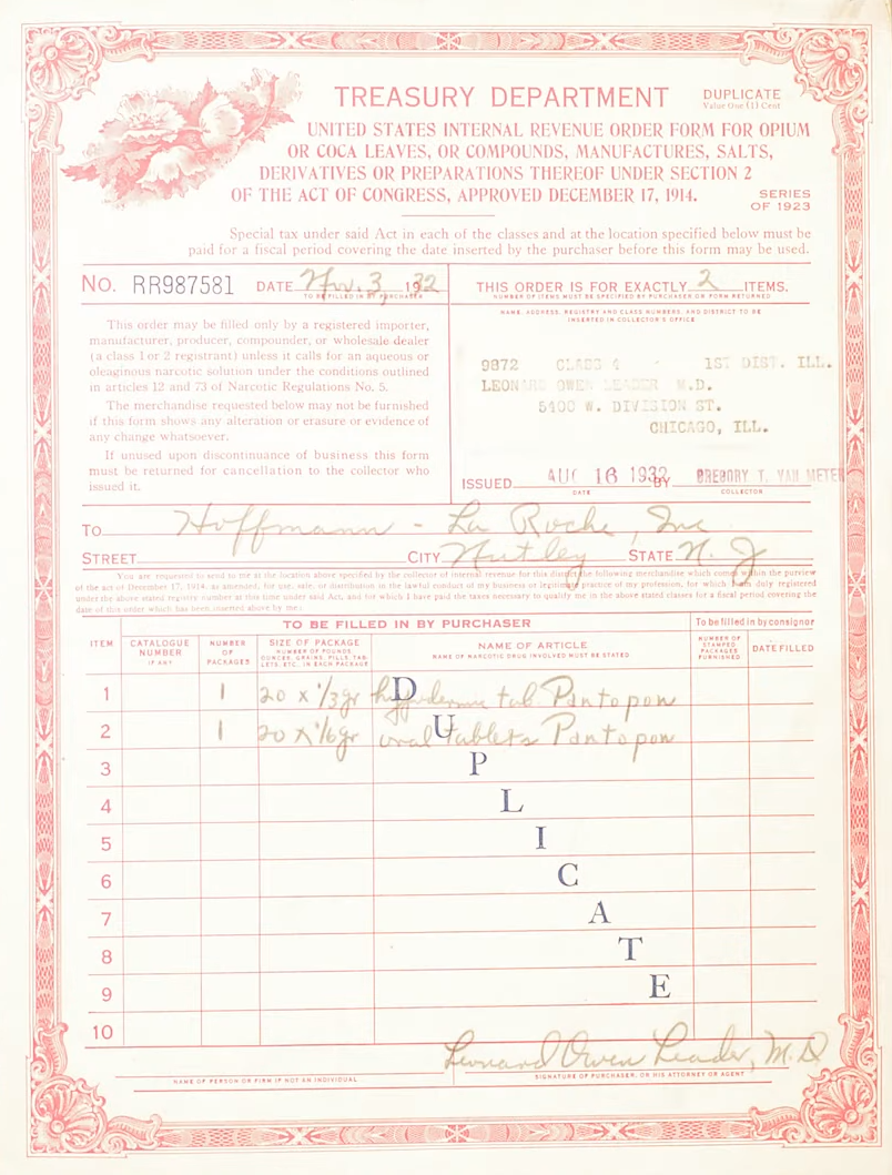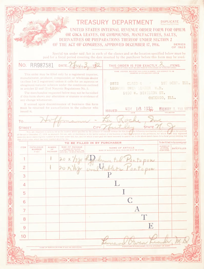 Kentucky ‘revenue collector,’ T. Scott Mayes conducted initial provisions under the new law and more than 1,100 names of druggists and physicians were placed on the government’s books prior to March 1, 1915, with a small penalty after that date. Manufacturers and importers had to furnish sworn inventories of quantities made or purchased. It was required of wholesale druggists to do the same, including quantities sold and to whom. Physicians were unable to purchase anything except with written order on the “narcotic order blanks” provided from the Collector of Internal Revenue. Consumers were unable to purchase except upon the prescription by a physician. Additionally, records had to be maintained and preserved for a minimum of three years and made available for inspection upon request by federal authorities. Penalties were set at $2,000 fine or give years’ imprisonment or both for violations or evasions of the new law.