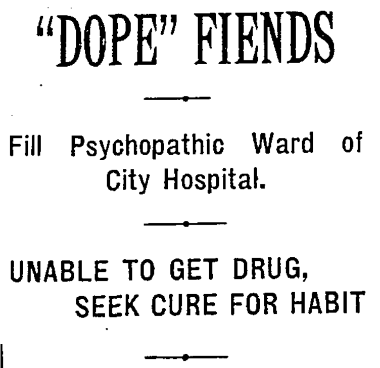“Effects of the new law did not become pronounced [in Louisville] as soon as in other large cities. Hospital and police officials in St. Louis, Pittsburg, and Philadelphia have adopted important relief programs; in Memphis a special “dope” hospital has been equipped and will begin its work to-day, while in Chicago, Gov. Dunne has taken a hand.”