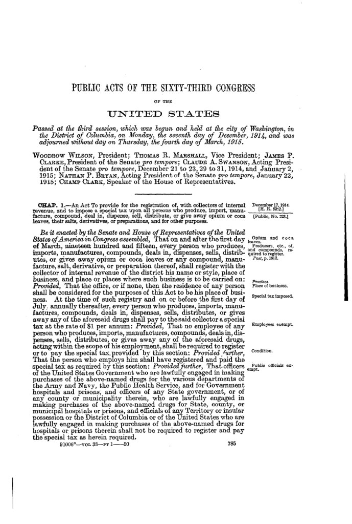 Sound familiar? In the United States, this will often bring back memories from multiple generations. From Nixon’s attempts at controlling drugs to Reagan and his wife Nancy amping up the War on Drugs. It might also conjure up memories of the D.A.R.E. program or Drug Abuse Resistance Education that many students were taught while in elementary or middle school, often by a police officer. It was all an attempt to target children at an early age to educate and prevent drug abuse. This war did not start in the 1960s, 70s, 80s or 90s. It started closer to the turn of the century in 1914. The Sixty-Third Congress established the Harrison Narcotics Tax Act which regulated and taxed narcotics. It was passed by the House and Senate and promptly signed by President Woodrow Wilson.