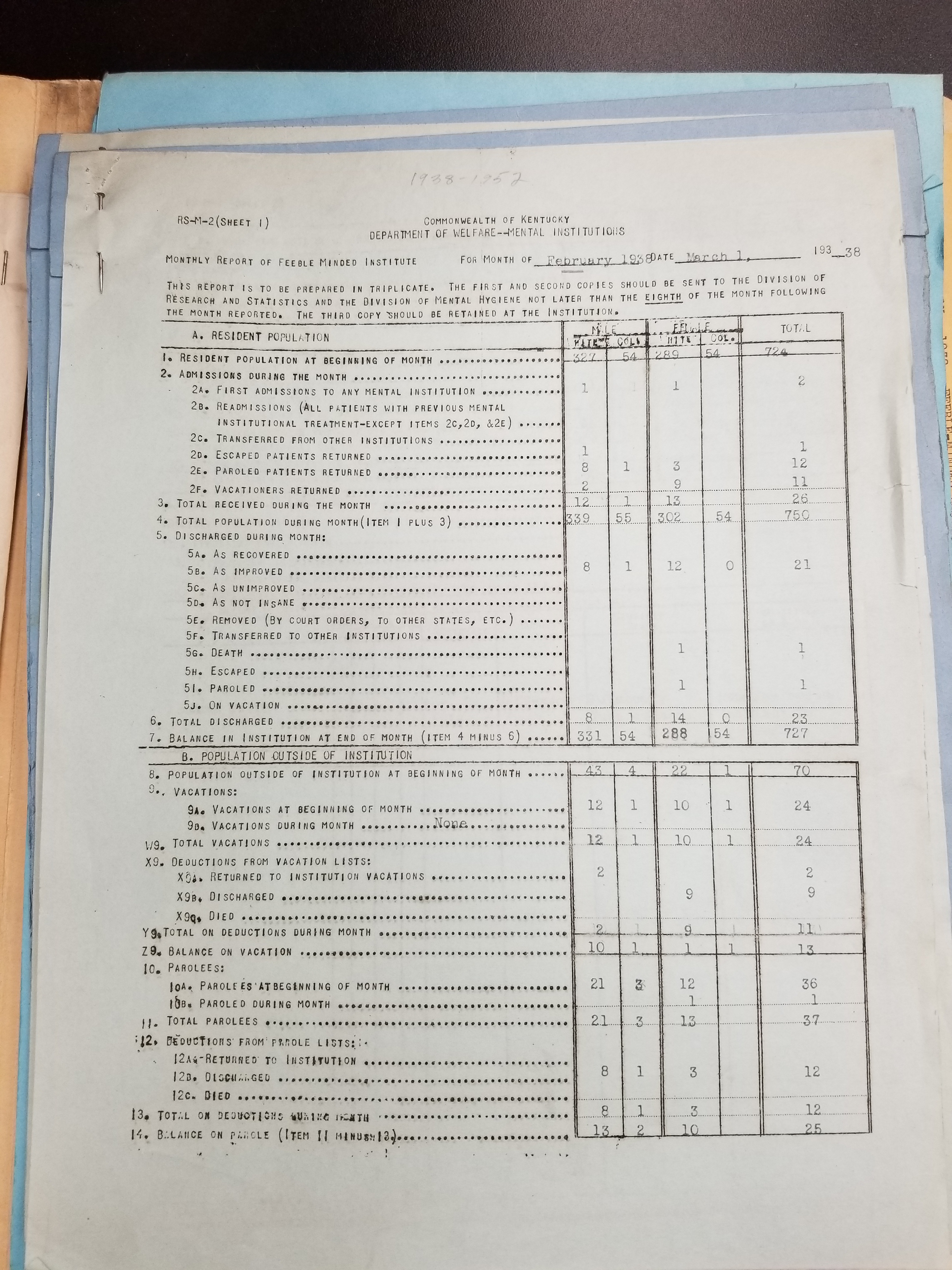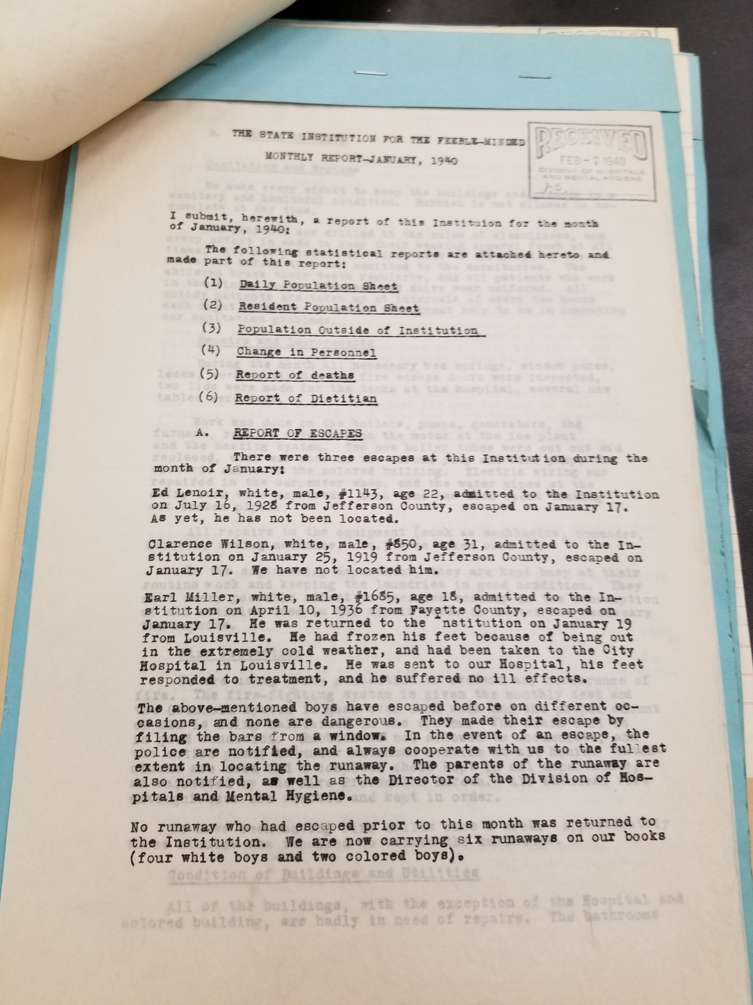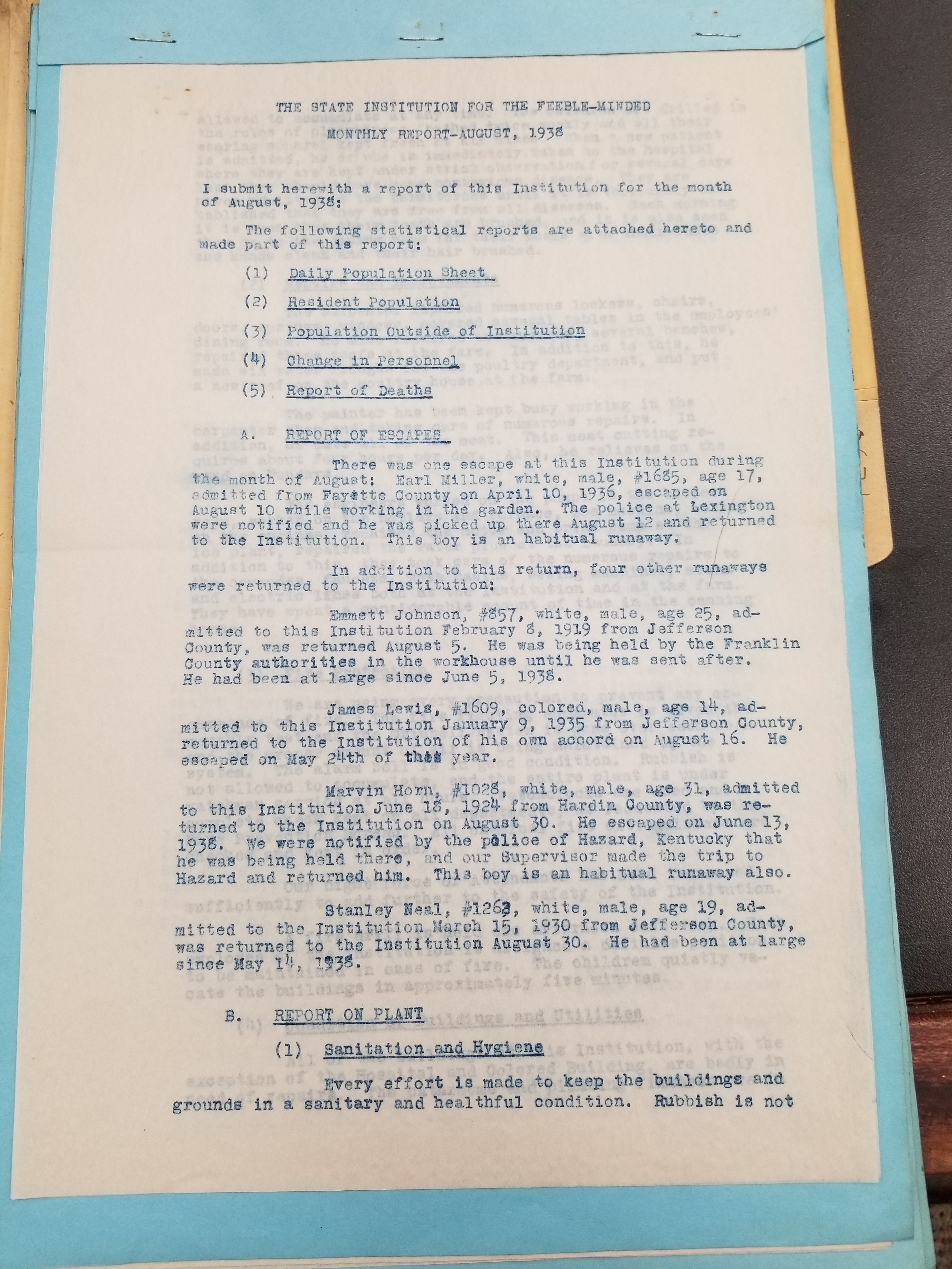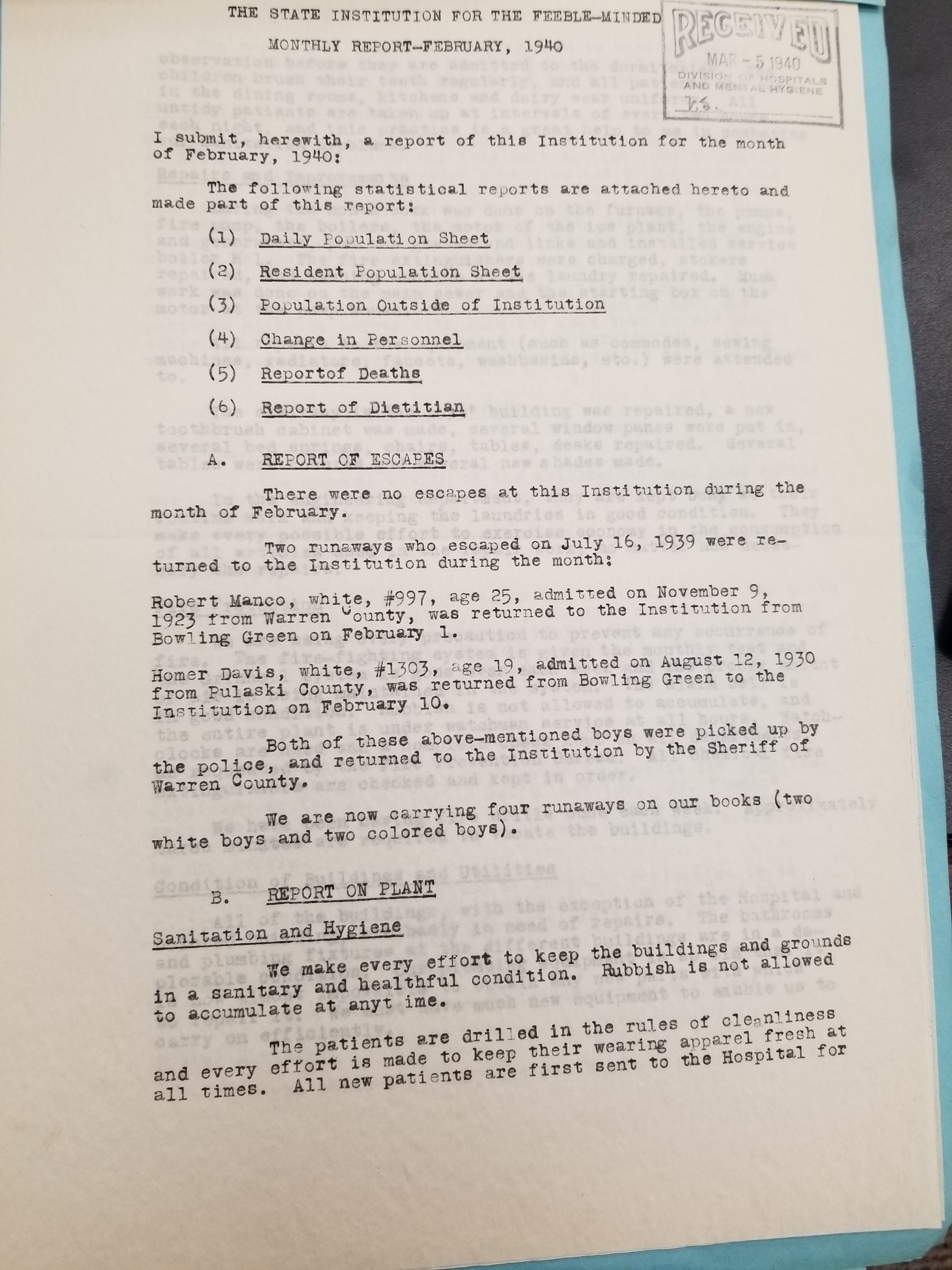 - Frankfort State Hospital and School (Frankfort, Kentucky). Monthly Reports, 1938-1952. Record Group 1428F, OCLC 907013356. Special Collections, Kentucky Department for Libraries and Archives, Frankfort, KY.
