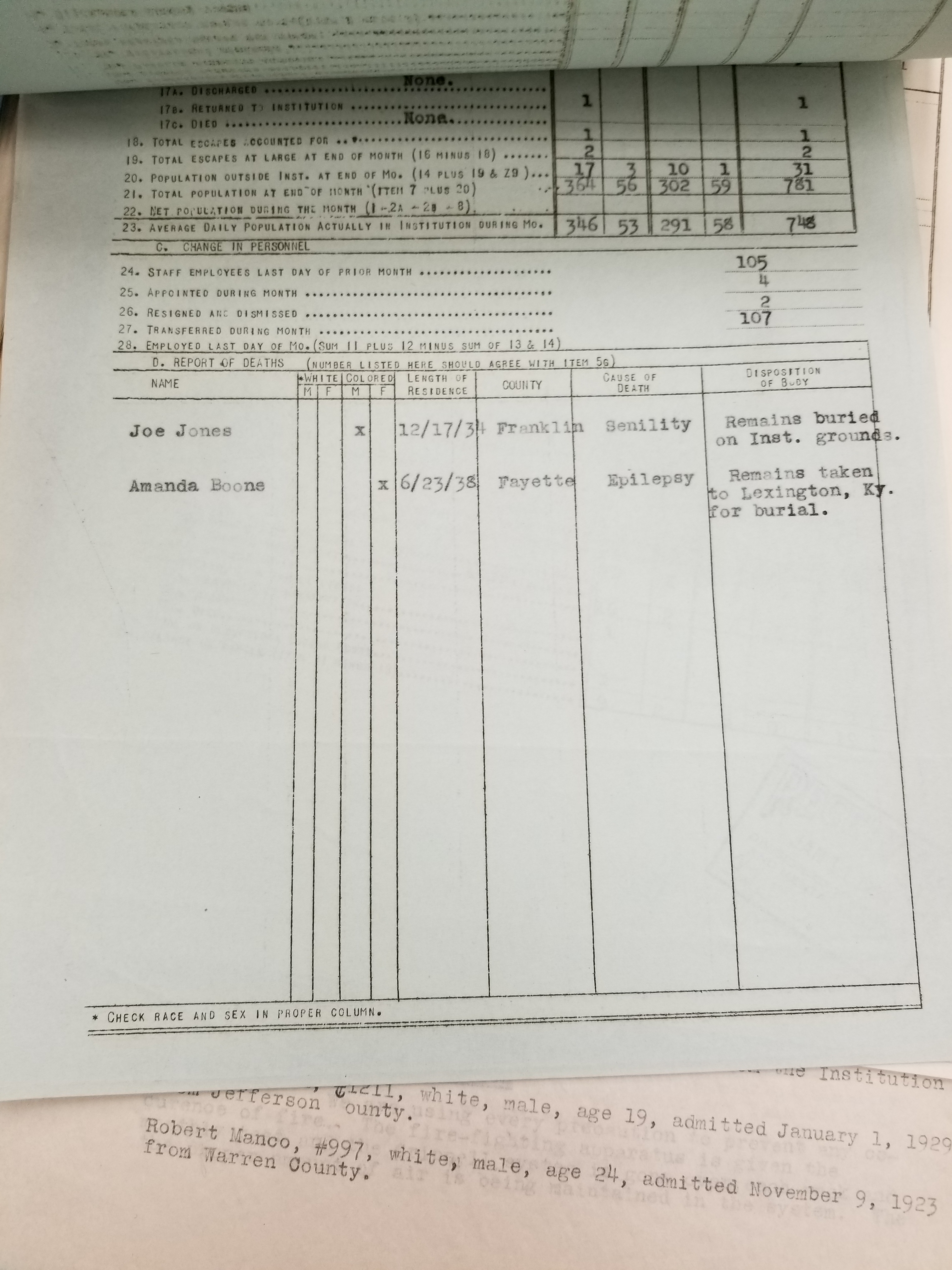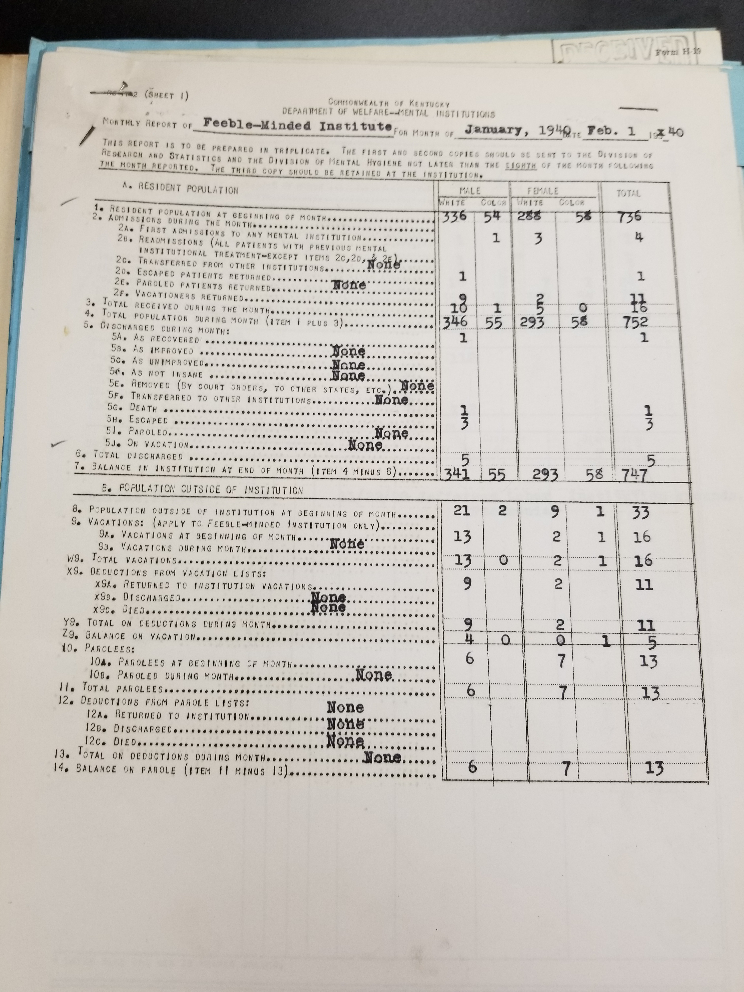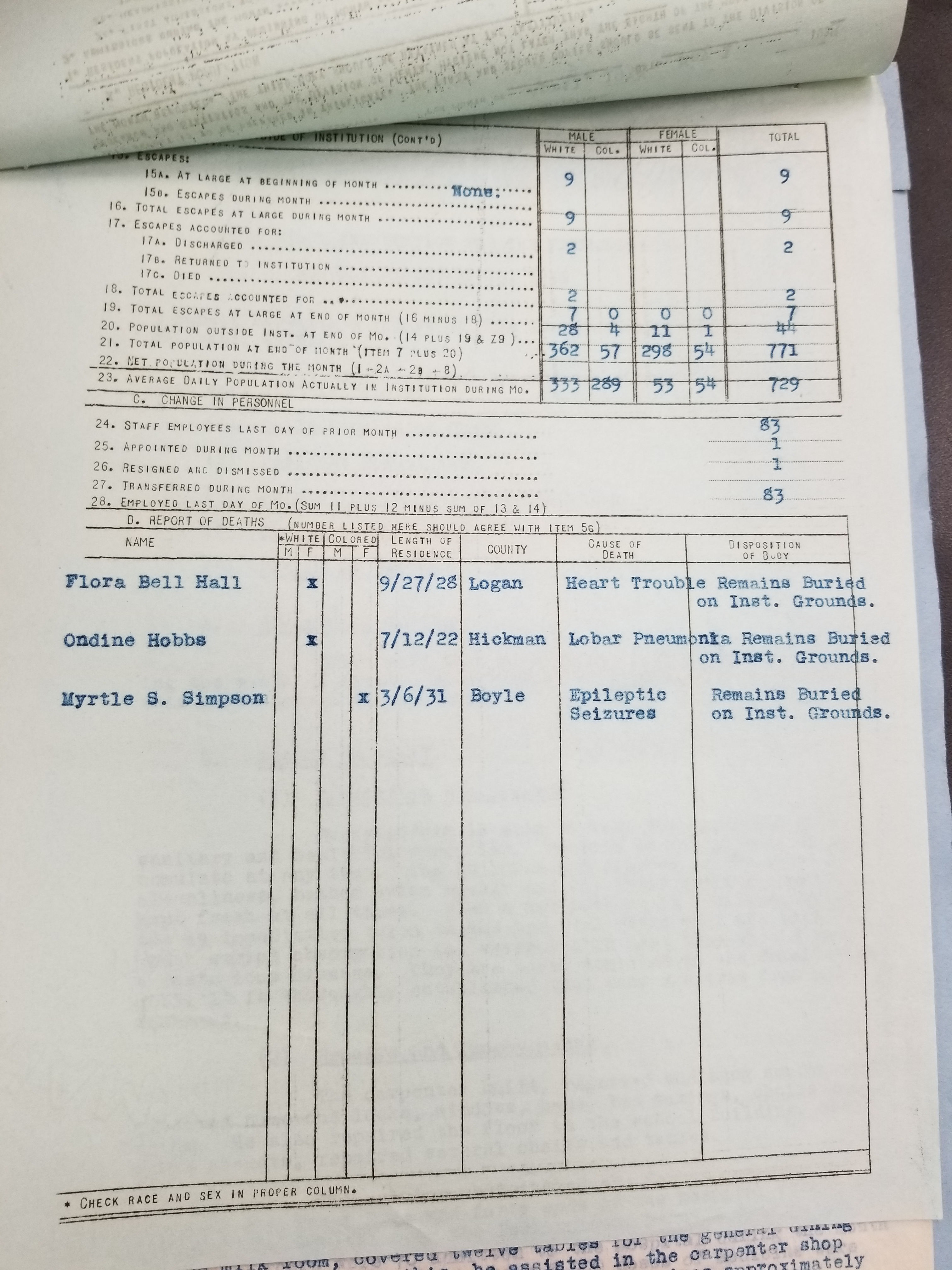 - Frankfort State Hospital and School (Frankfort, Kentucky). Monthly Reports, 1938-1952. Record Group 1428F, OCLC 907013356. Special Collections, Kentucky Department for Libraries and Archives, Frankfort, KY.
