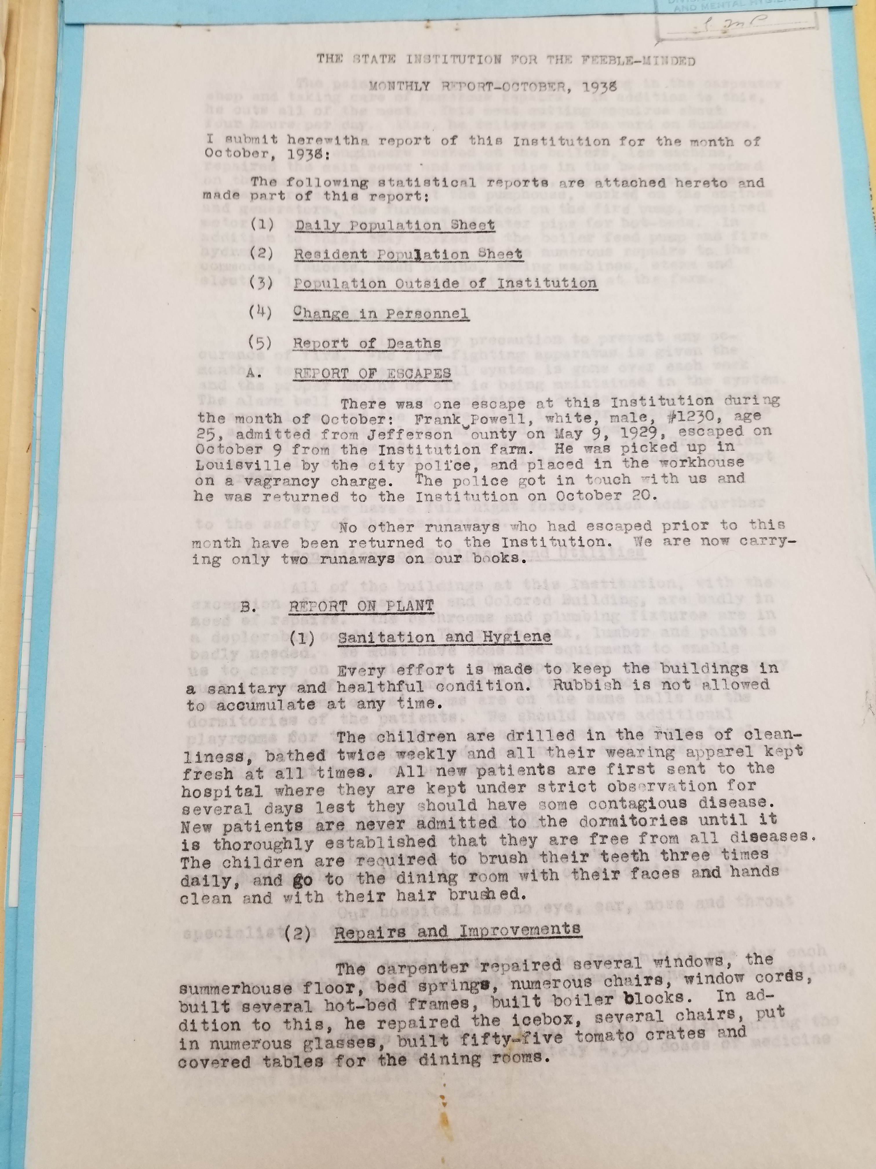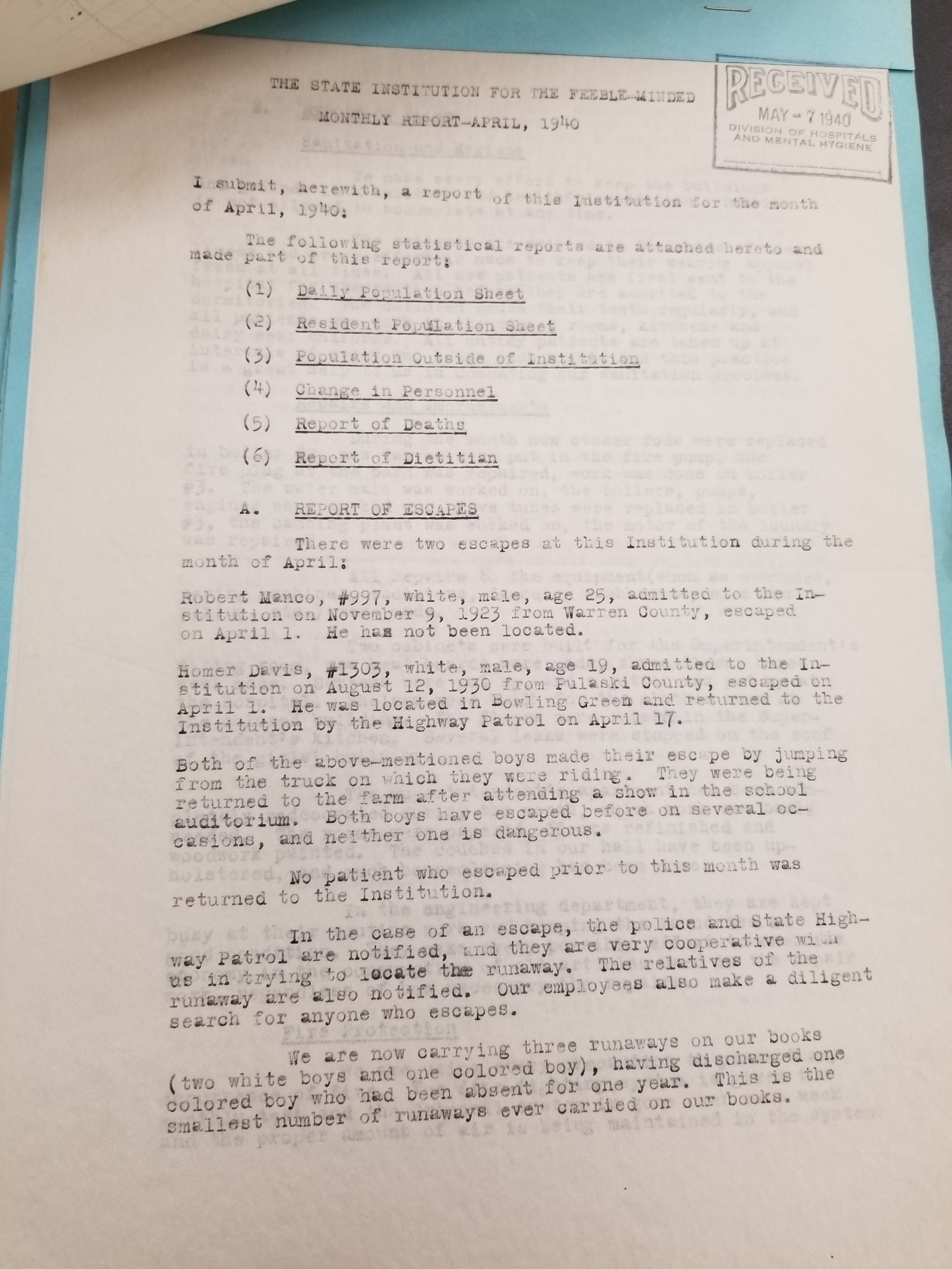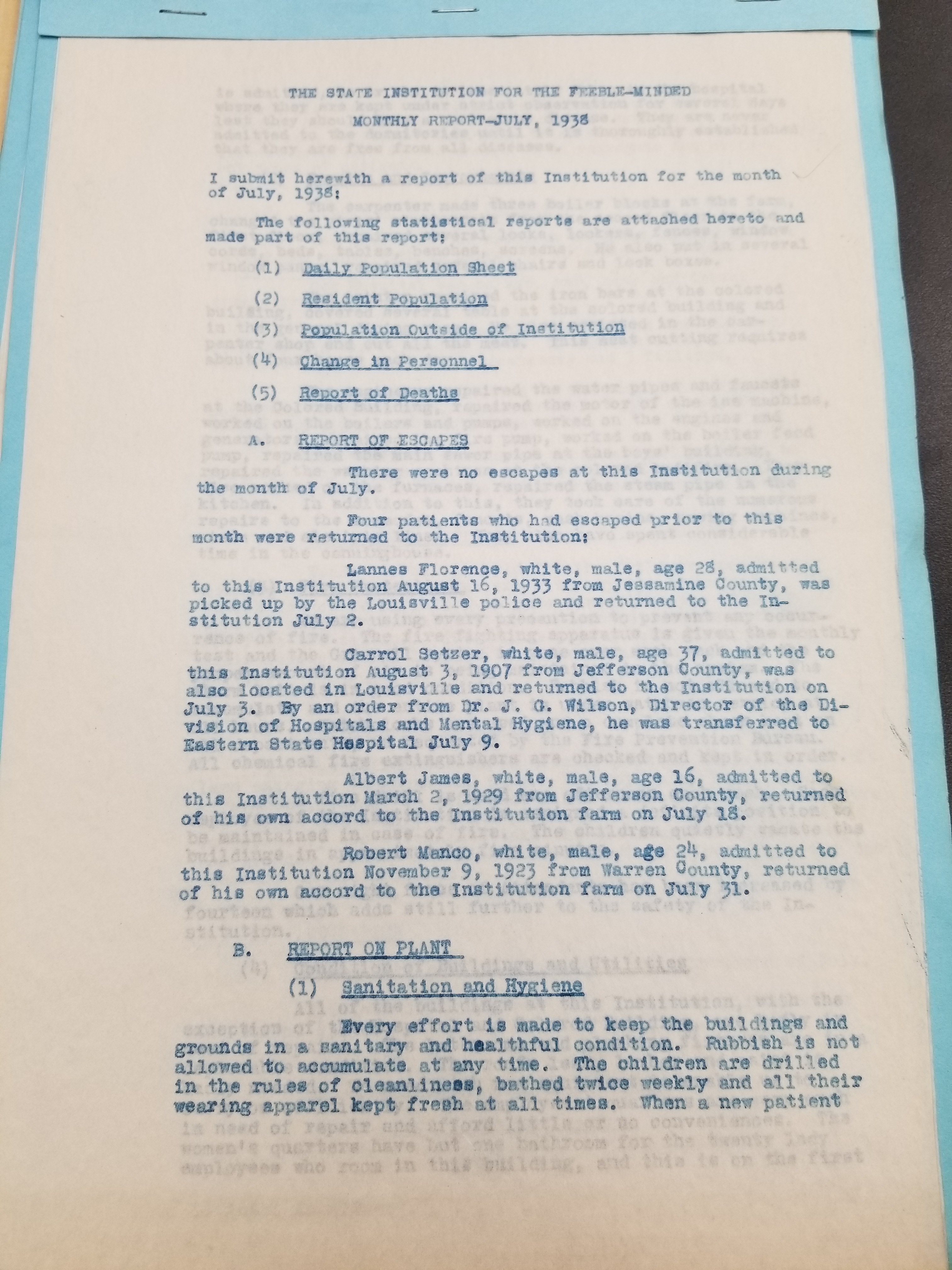 These reports show the activities of Frankfort State Hospital/State Institution for the Feeble Minded for the specified month. Please note that these reports will be better grouped by month and date as we upload more of them. Please check back often for updates.