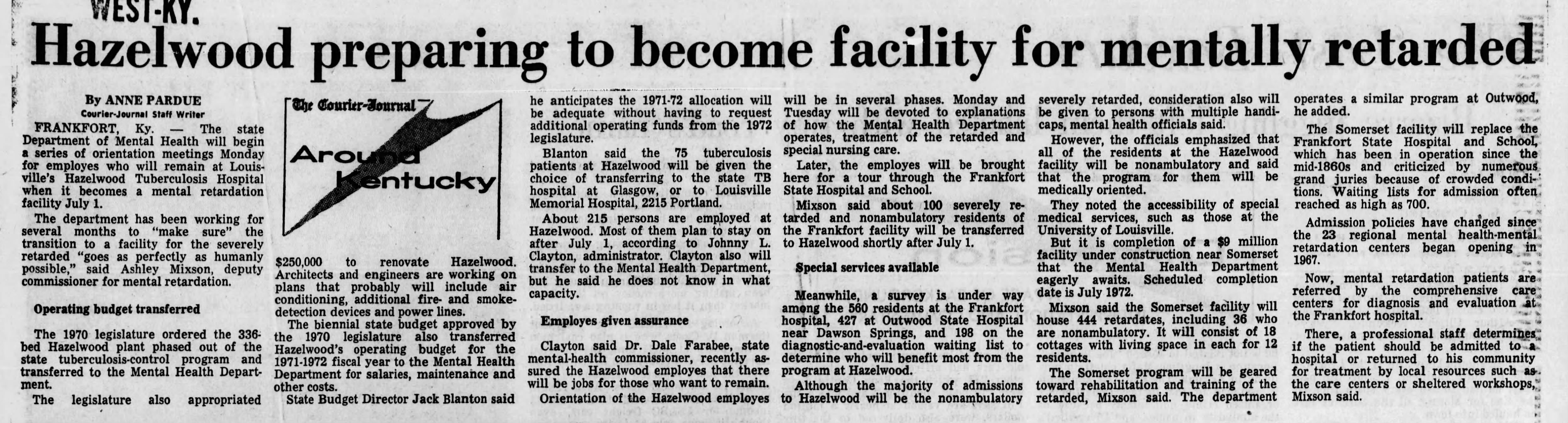 Opened in 1907 thanks, in part, to the Kentucky Anti-Tuberculosis Association, Hazelwood Sanatorium has had a number of names and purposes over the years. After a fire in 1915 which destroyed the original hospital, efforts were quickly made to rebuild and replace. In the early 1970s, Hazelwood Sanatorium followed the same path that many other tuberculosis hospitals did and ceased to operate as a treatment facility for tubercular cases. This was objected by some physicians as they felt the need existed to maintain a facility for treating tuberculosis despite advances in treatments. It was later refurbished to house individuals with developmental disabilities and as a replacement for the crib units at Kentucky’s Frankfort State Hospital. Hazelwood had a peak of approximately 200 patients in the middle of the century and operates today as Hazelwood Intermediate Care Facility (main building only).