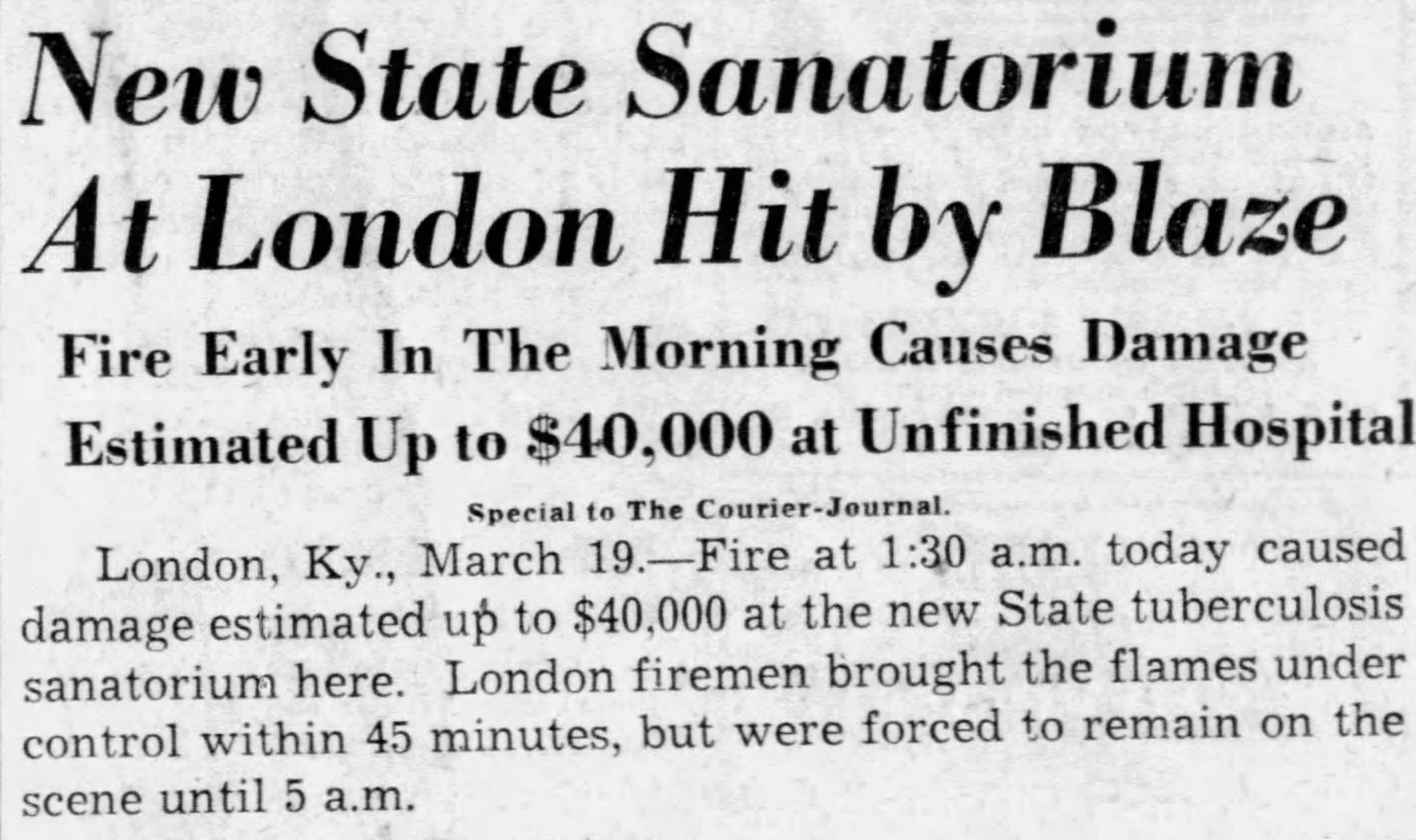 The District Five Tuberculosis Sanatorium located in London completed construction of all buildings in mid-June of 1950. Governor Lawrence Wetherby and Dr. C. E. Reddick headed the dedication ceremonies which were attended by several hundred people. According to reports, the hospital received its first patient at the end of January and, at the dedication ceremony, were able to house one hundred patients. As with the other Tuberculosis Sanatoriums in Kentucky, the cost of the entire project was $1,500,000. The beds in the hospital were allocated to each county within the tuberculosis district and were largely based on the 1940 census information. In late March of 1950, a fire caused $40,000 worth of damage to the unfinished portions.