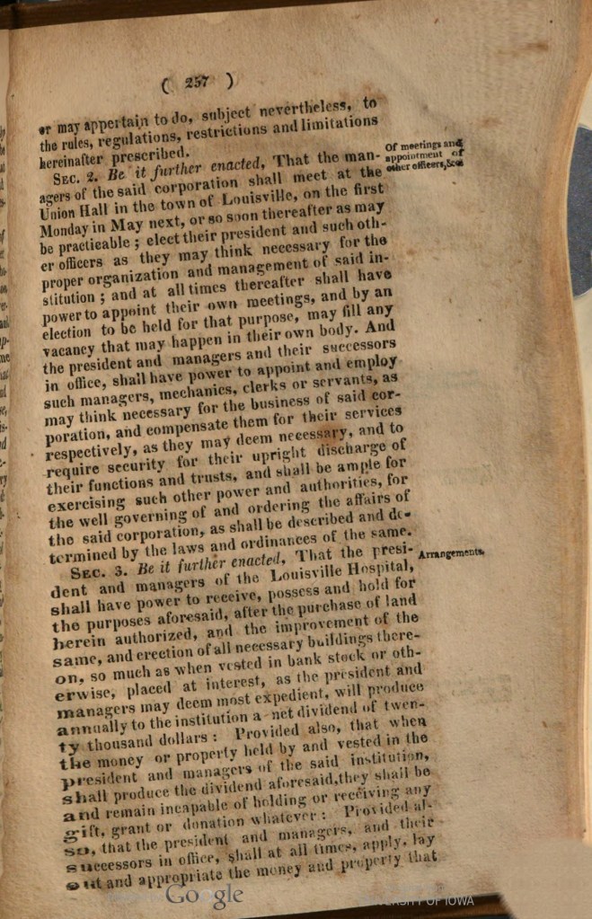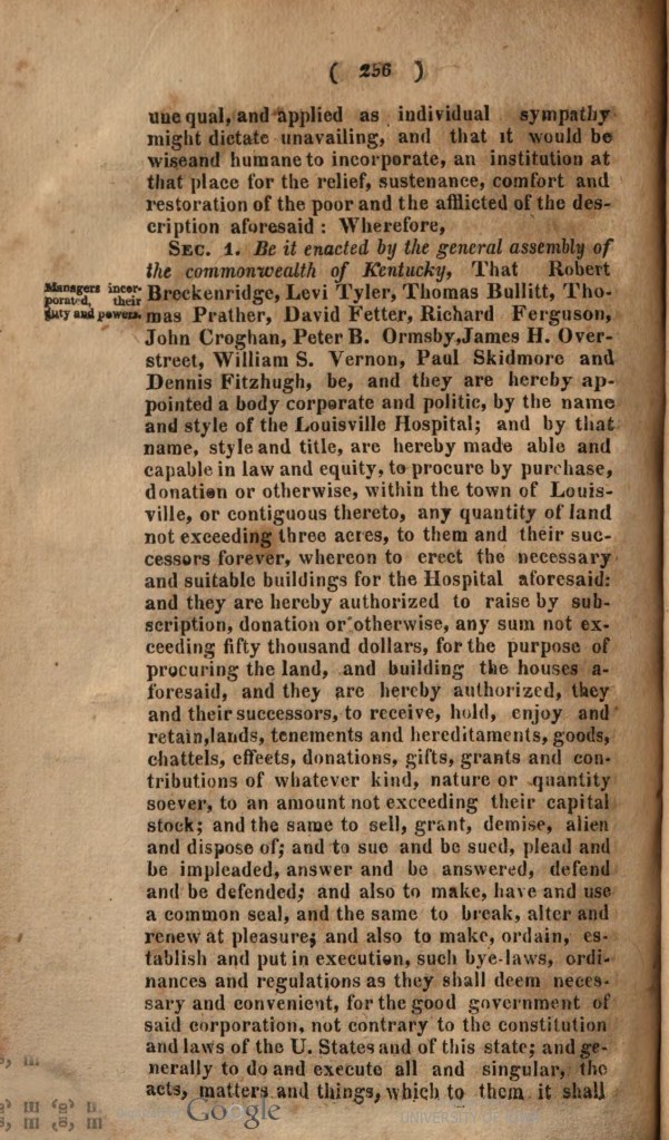 “Whereas it is represented, that of those engaged in navigating the Ohio and Mississippi rivers, many persons owing to the fatigue and exposure incident to long voyages, become sick, and languish at the town of Louisville, where the commerce in which they are engaged, sustains a pause occasioned by the falls of Ohio River; that the charity of the citizens of that town, and county is no longer able to administer to those poor unfortunate person, the support and attention which the necessities of the latter, and the humanity of the former would seem to demand and prescribe; that the growing character of Louisville, as a place as well of import as export, and the growing commerce of this state, and of the western country, connected with that place, threatens to throw an increased mass of unfortunate sick upon the citizens of that town and county, to the comfort and support of whom the resources subject to the exaction of charity would be unequal, and applied as individual sympathy might dictate unavailing, and that it would be wise and humane to incorporate, an institution at that place for the relief, sustenance, comfort and restoration of the poor and the afflicted of the description aforesaid.”