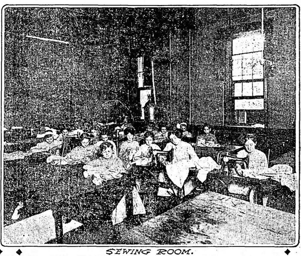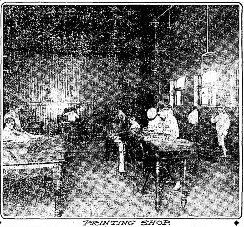 The carpenter’s shop was headed by Mr. W. L. Day who had thirty years’ experience in his work. The shop had an engine, four wood lathes, two trip saws, a farmer, two scroll saws and a sticker, and a complete set of carpenters’ tools. Wood-turning lathes and screw lathes were supplied for the smaller boys. All of the furniture of the institution was made here by boys ages ten to eighteen. This included bookcases, desks, mantels, vases, and many other “gems.” The printing department ensured that the boys had practical training in setting type and doing press work for a little paper. This paper was called The Gem and was published every week. Mr. Thos. Cummings headed the printing department and was instructor of the School of Reform Band which contained 21 pieces. A garden of thirty acres provided fresh vegetables and kept thirty youngsters employed. Their training in this area was, “at the hands of an old negro who is adept in that essentially African art of ‘raisin’ craps.” The cane-seating department made seats for the institutions 10,844 chairs; the mattresses were made in this department as well. Additionally, there were young blacksmiths and shoemakers. Boys who did not find work in any of these departments would go ‘at large’ to work on the buildings throughout the campus. The girls were taught household duties that would help them to become “effective helps in the homes of others or to beautify and make attractive of their own.” All of the sewing, cooking, and other ‘numberless’ details were conducted by the girls who were equally successful in the boys.