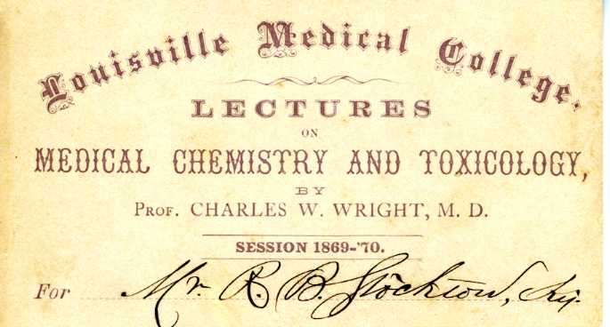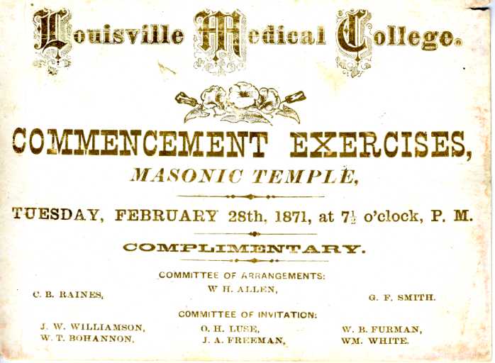 In 1869 a group of young physicians collaborated together to form the Louisville Medical College, the third college of medicine in the state of Kentucky. The first graduated in 1870. Classes were graduated each subsequent year. The faculty included eight professors and three demonstrators. This particular College of Medicine did not have any university affiliation and used a charter, granted in 1854, that was originally intended for the establishment of a medical school to be known as the Clay School of Medicine. The Clay School, however, never came to fruition. In 1874, the Kentucky School of Medicine was reorganized as a “Spring” school and it would share building facilities with the Louisville Medical College, the latter being a “Fall” school. As such, students at Louisville Medical College were encouraged to apply for the Spring session with the Kentucky School of Medicine. Not only was this reciprocal agreement faster for students there was also a reduction in tuition. This, however, was not welcomed with open arms in the medical community. A meeting of the Association of American Medical Colleges resulted in the condemnation of colleges of medicine that were considered low-cost.