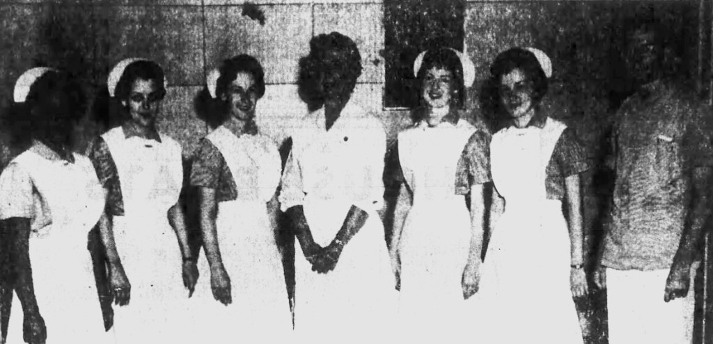 The first class to graduate from the Miners Memorial Hospital Association School of Professional Nursing received their diplomas and pins September 14, 1960. The ceremonies took place in the auditorium of the Harlan High School and included thirteen young women and three young men. All students were from Kentucky, West Virginia, or Virginia high schools with most of them being from the Appalachian mountain region. Nearly half of the first class previously worked non-professional jobs before starting their nursing careers.