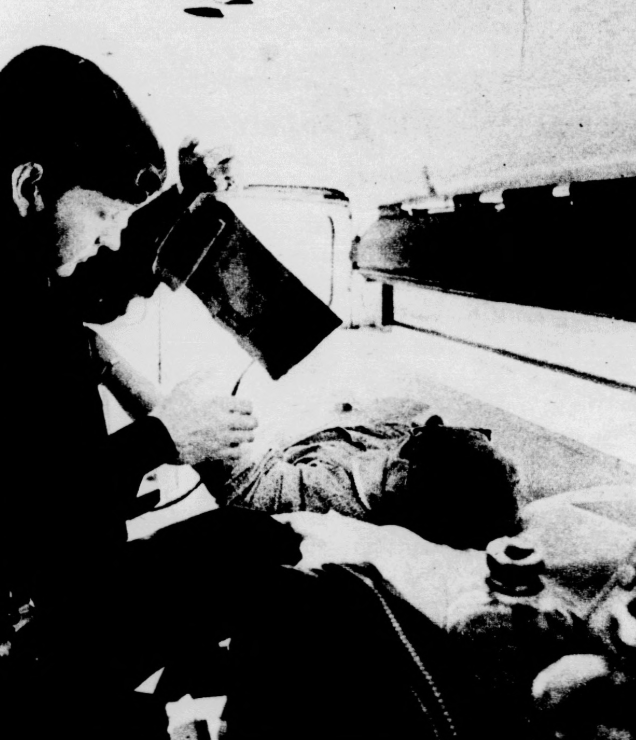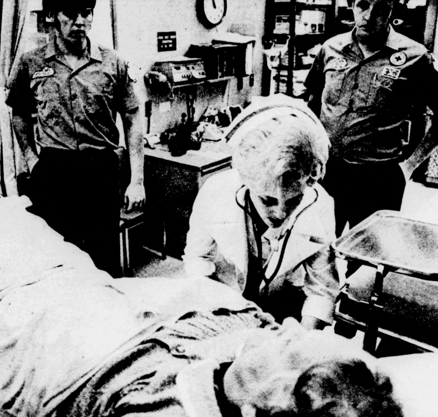 Appalachian Regional Hospitals, Inc. operated an eight-county ambulance service with a home-base at the ARH Hazard where trained attendants could reach into the hills to service more people in Eastern Kentucky. Pictured is an ambulance transporting a sick elderly woman from her home to the emergency room in Hazard.