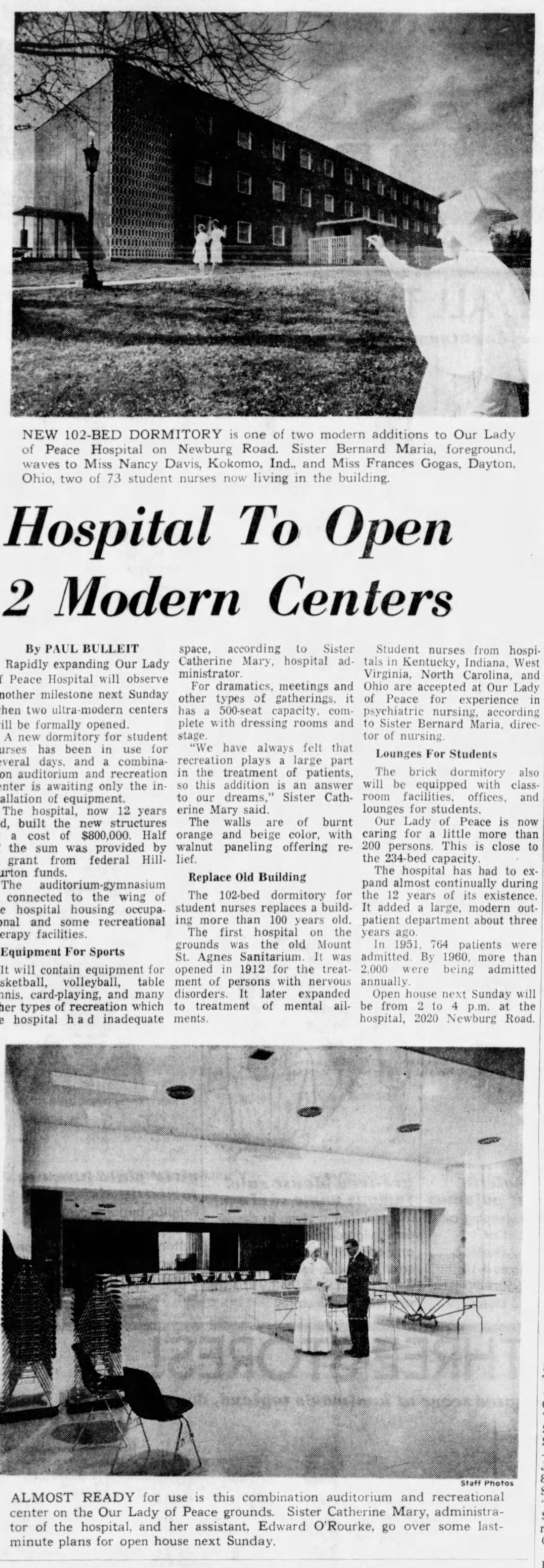 Our Lady of Peace Hospital was founded in 1951 by the Sisters of Charity of Nazareth as a treatment facility for adults with mental disorders. The first superintendent of the hospital was Sister Mary Benigna. Five psychiatrists made up the clinical treatment team including Drs. John Bell, Louis M. Foltz, Arthur R. Kasey, Jr., John Trawick, Jr., and Joseph Goldstein. Soon after opening, Our Lady of Peace had approximately 70 patients with a capacity of 150 patients. Approximately 33 of those patients were transferred from Mount St. Agnes Hospital (which was later converted to a nurses’ home for Our Lady of Peace). The program for mental patients was touted by Louisville psychiatrists, “as fine as any in the country (Courier-Journal, 1951).”