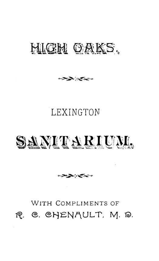 Our Lady of the Oaks began its life originally as High Oaks Sanitarium headed by former Eastern State Hospital superintendent, Dr. R. C. Chenault. An informational book published by Dr. Chenault noted that High Oaks was a private hospital to be used for the treatment of mild mental troubles, nervous diseases, and substance use issues such as “alcoholic stimulants,” cocaine, and opium. Dr. Chenault also said of the buildings that, “the walls are very thick, making the house warm in winter and cool in summer.” The campus also contained cottages for patients in addition to a three-story main building. In addition to Dr. Chenault and a competent nursing staff, he anticipated working with his daughter, a former assistant physician at Cook County Hospital and a graduate of the Woman’s Medical College of Chicago. Per rules of the hospital, patients were not received if they would be treated for less than one month as a several-months stay was usually necessary.