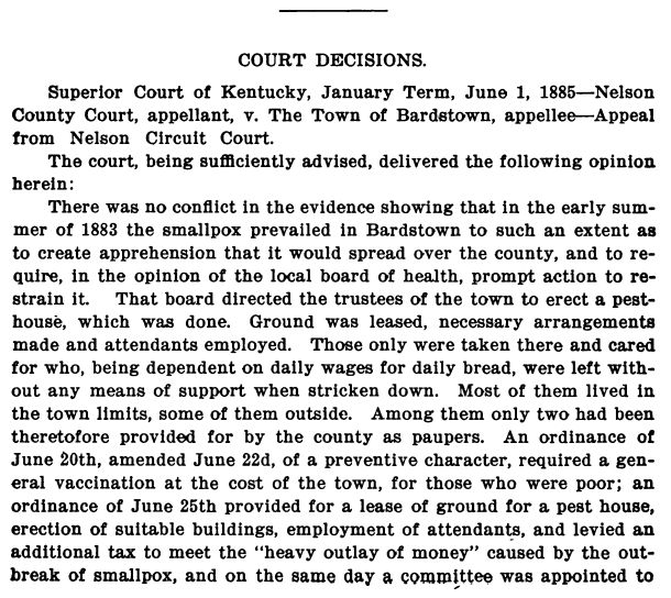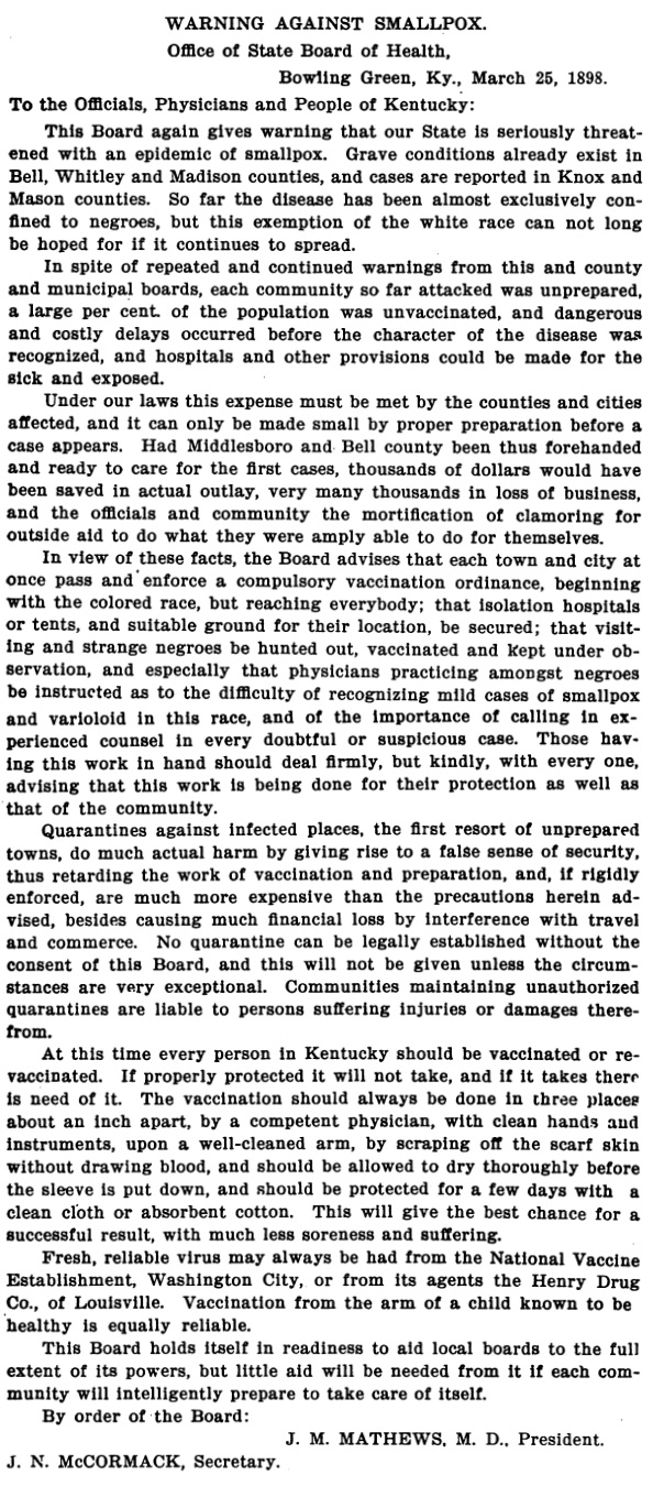 In spite of these “admonitions” from the State Board of Health, towns and counties were largely found to be unprepared to deal with the disease and thus it spread from place to place. By 1899, the State Board of Health had already exhausted its fund to the point of being overdrawn at the bank. The State Board of Health could only send inspectors to counties whose fiscal authorities would agree in advance to bear the expense. In the same year, smallpox had affected 110 out of 119 of Kentucky’s counties. Once the State Board of Health began exerting their authority, it had a salutary effect.