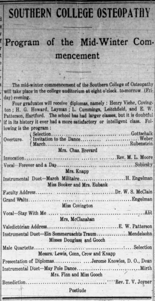 The Southern School of Osteopathy was first established in March of 1898 by George F. Nason, John S. Oldham, and J. S. Gaylord. The first president of the school was Dr. J. S. Gaylord, succeeded by Dr. J. S. Oldham and Dr. Robert W. Bowling. The first matriculated class at the school began upon its opening with a total of twenty-six students and twenty-one of them graduated. It was among the first schools of Osteopathy in the United States and quickly earned a positive, but short-lived, reputation.