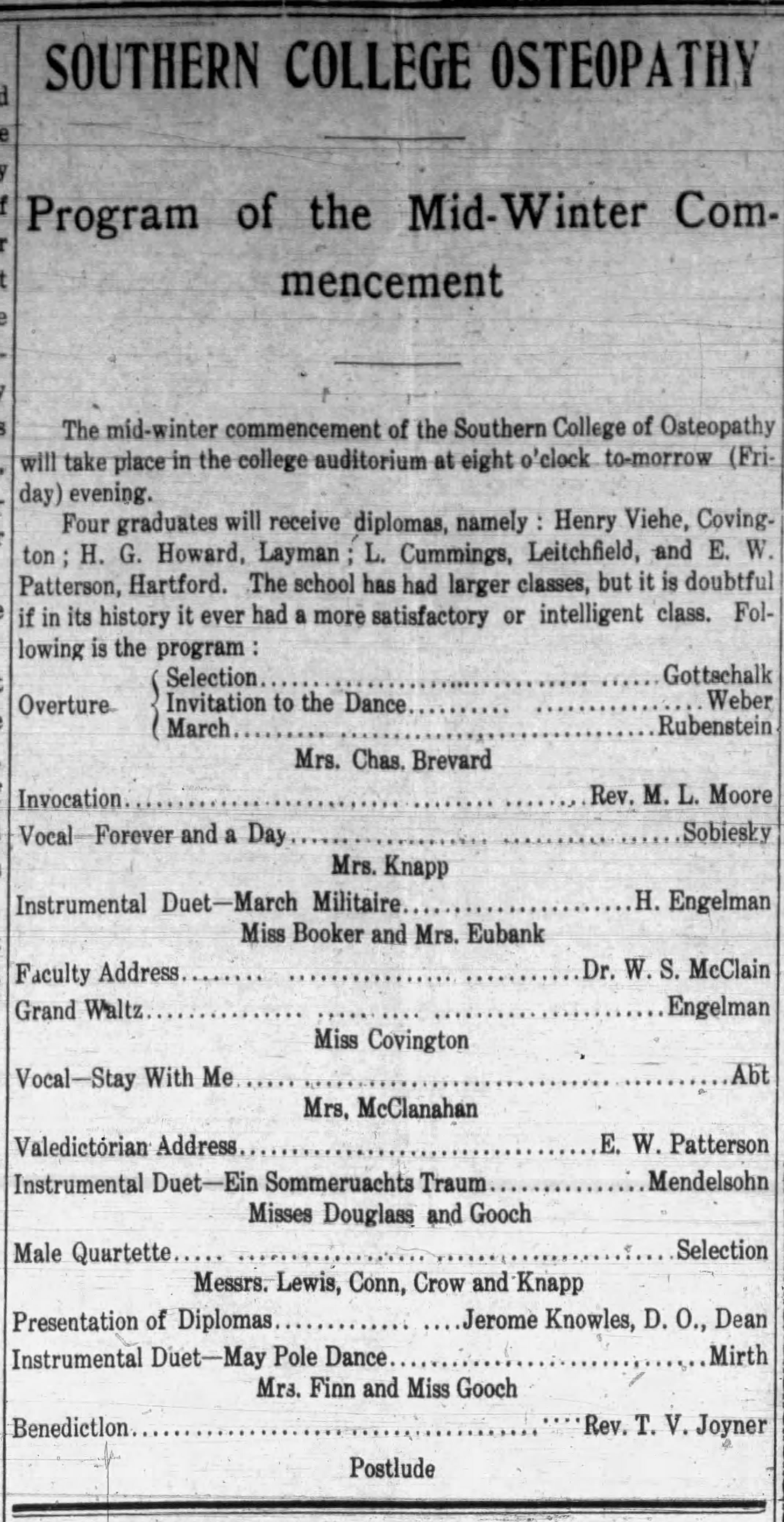 The Southern School of Osteopathy was first established in March of 1898 by George F. Nason, John S. Oldham, and J. S. Gaylord. The first president of the school was Dr. J. S. Gaylord, succeeded by Dr. J. S. Oldham and Dr. Robert W. Bowling. The first matriculated class at the school began upon its opening with a total of twenty-six students and twenty-one of them graduated. It was among the first schools of Osteopathy in the United States and quickly earned a positive, but short-lived, reputation.