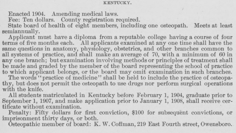 Osteopathy in general was not always well-received in the United States. In Kentucky, the Court of Appeals granted a “perpetual injunction” against the State Board of Health preventing them from further interference with the practice of Osteopathy in the Commonwealth. As a burgeoning field it differed from both allopathy and homeopathy yet struggled to differentiate itself as a legitimate field of science and medicine. The program in Franklin lasted 20 months and afforded its graduates to practice osteopathic medicine. Some reports noted that graduates from Franklin were making as much as $500 per month in 1900.