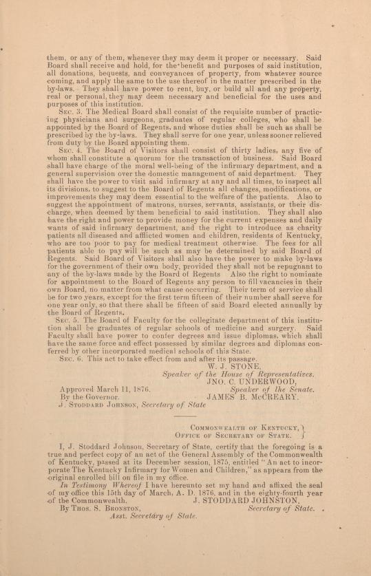 - The Kentucky Infirmary for Women and Children, chartered by the State of Kentucky, is the first women’s hospital established south of the Ohio river, and the only charitable institution in the city of Louisville which [received] patients from the State at large.