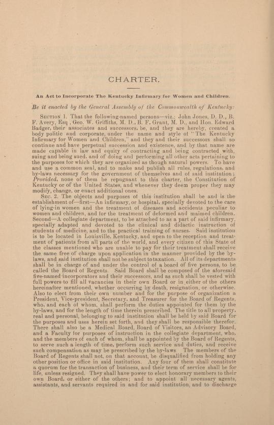 - The Kentucky Infirmary for Women and Children, chartered by the State of Kentucky, is the first women’s hospital established south of the Ohio river, and the only charitable institution in the city of Louisville which [received] patients from the State at large.