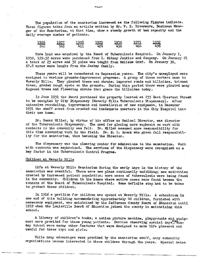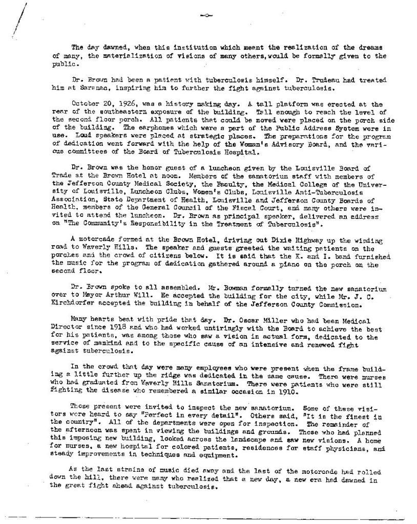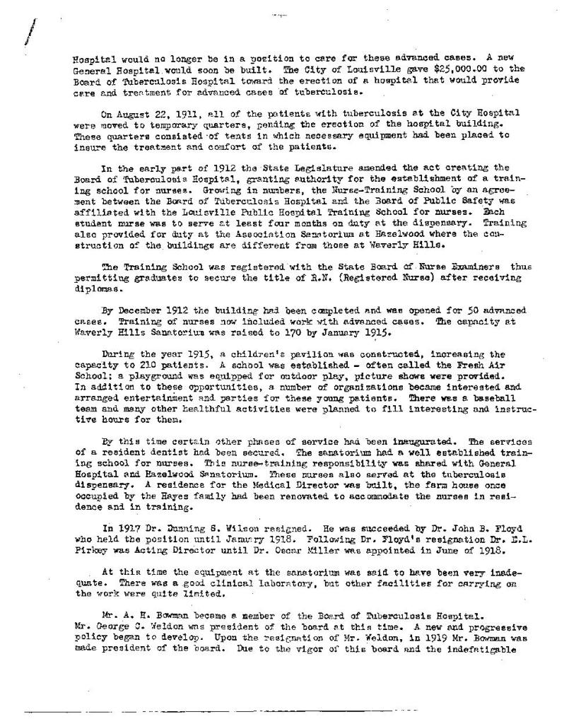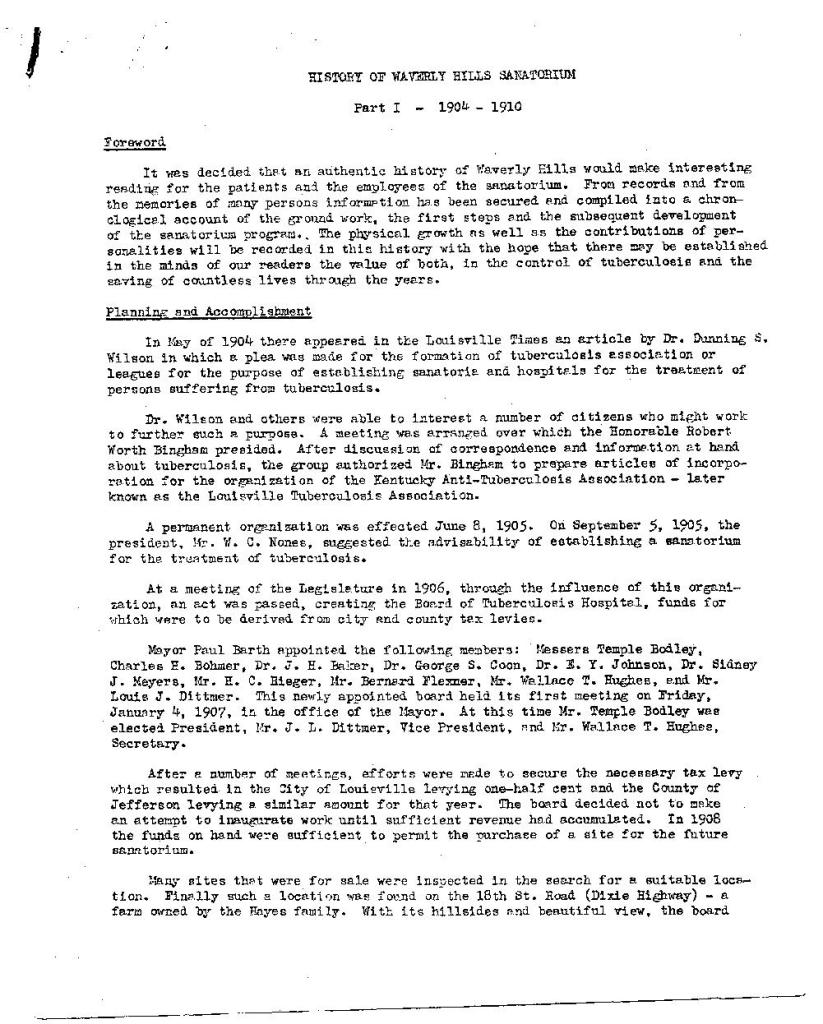 The following is a comprehensive history of the Waverly Hills Sanatorium with handwritten notes from the Medical Director, Dr. Alvin B. Mullen. Dr. Mullen, a native of Louisville, attended the University of Louisville School of Medicine and, after completing a one year internship in Pittsburgh, PA, he returned to Louisville and the Waverly Hills Sanatorium where his family remained in Jeffersonville. Dr. Mullen joined Waverly Hills in 1926 and was commissioned as a Major in the United States military during the Second World War. Dr. Mullen spent the bulk of his career treating tubercular patients until his retirement. After Waverly Hills closed in 1961, Dr. Mullen continued his work as director of the tuberculosis clinical operations for the Louisville-Jefferson County Health Department until his retirement in 1972. Dr. Mullen died in 1993.